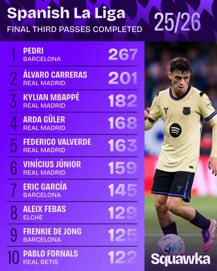 10月7日讯 日前,Squawka统计了本赛季西甲攻击 三区传送球 次数排行,欧洲杯直播吧佩德里267次居首,5名皇击鞠 员进前十。