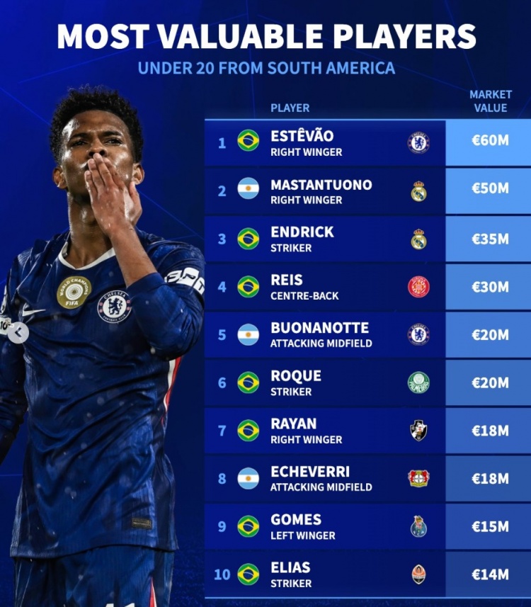 10月30日讯 《转会市场》统计了南美籍U20球员身价情况,切尔西新星埃斯特旺领跑。