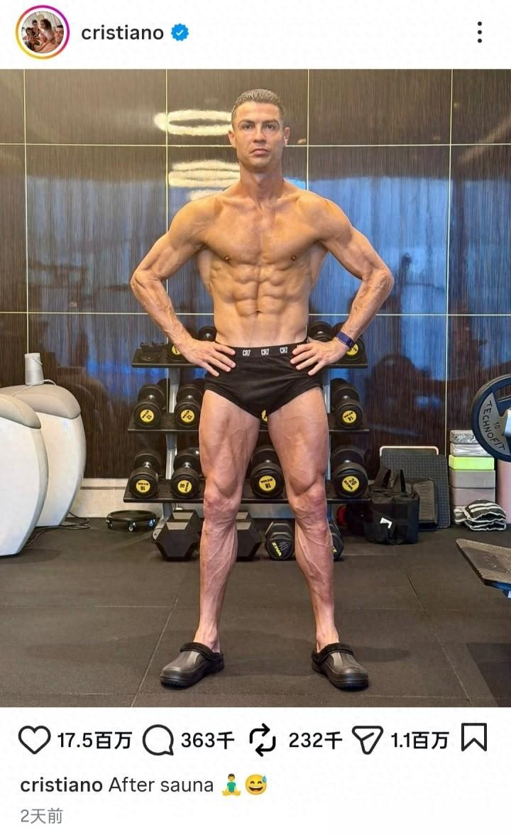40 岁 C 罗的身材照,与其说是个人魅力的展现,不如说是对职业运动精神 的最好诠释。而国足与他的差距,从来不止是身材,更是自律、敬畏与职业态度的鸿沟。