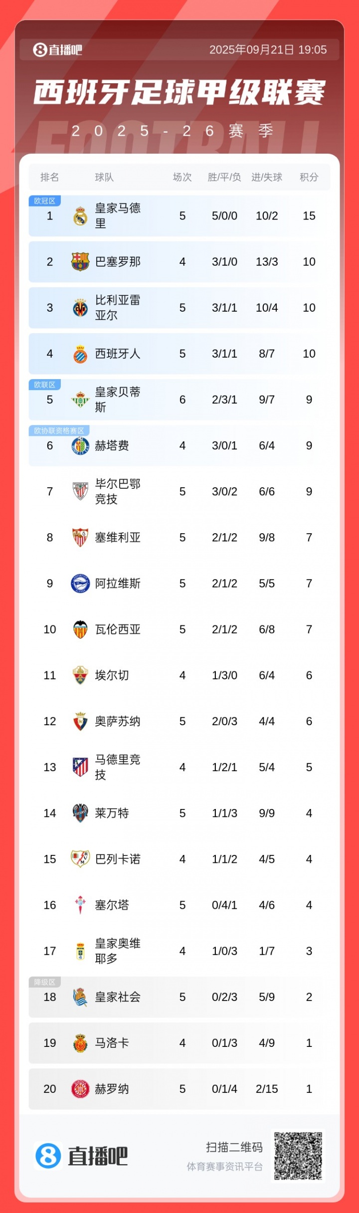 09月21日讯 西甲第5轮,赫罗纳主场作战 0-4大败 于莱万特,继续稳居西甲垫底位置。本赛季西甲前5轮,赫罗纳仅取得1平4负,排名西甲倒数第一。