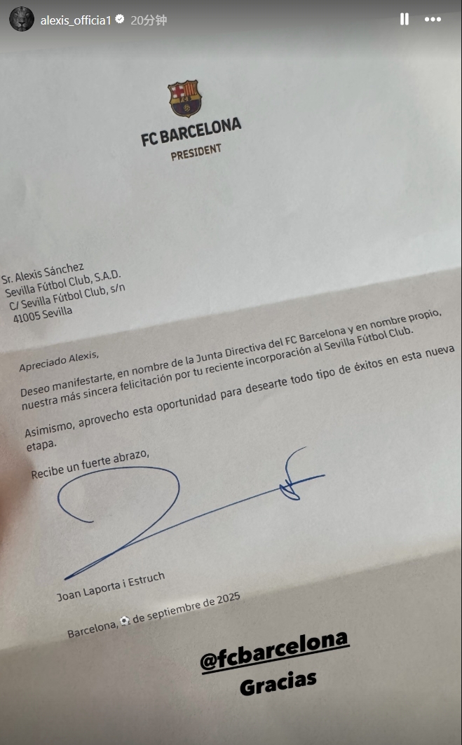 09月23日讯 36岁的智利前场球员、巴萨旧将桑切斯今夏回归西甲加盟塞维利亚。今天他更新社媒,展示了一封老东家巴萨发来的贺信。信中大致写道: