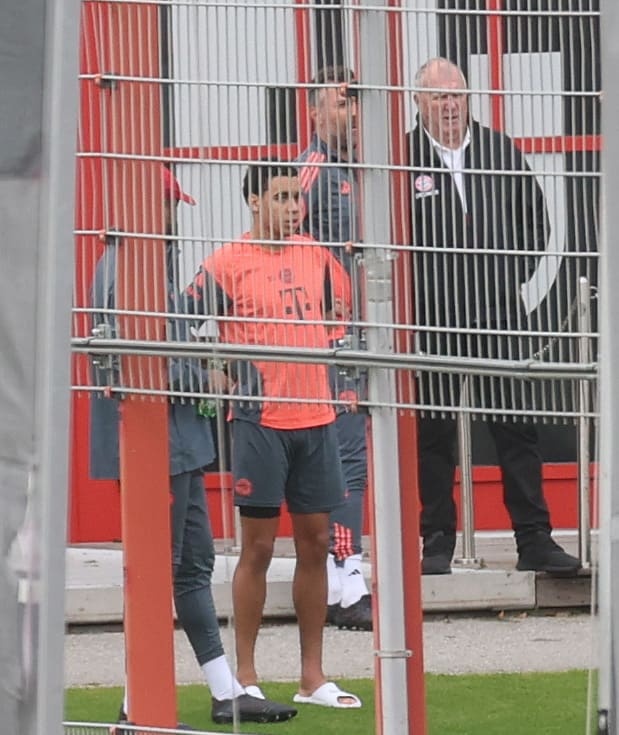 周四中午在拜仁的队友们进行赛前最后一次练习 时,《图片报》在塞贝纳大街练习 场边拍到了穆西亚拉:他穿着拖鞋出现在练习 前,和他的队友们开着玩笑,心情非常好。在练习 开始前,他与主指导教练员孔帕尼交谈了将近五分钟。