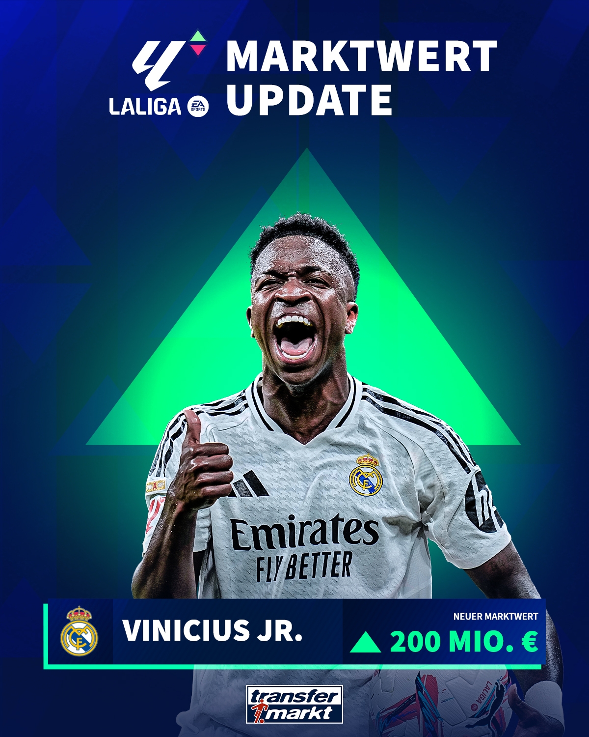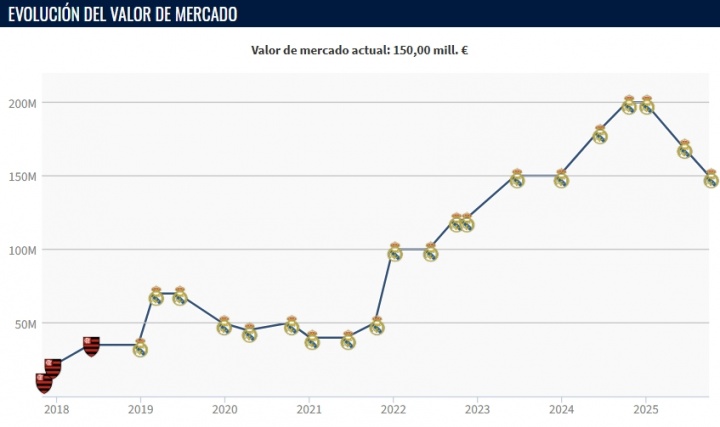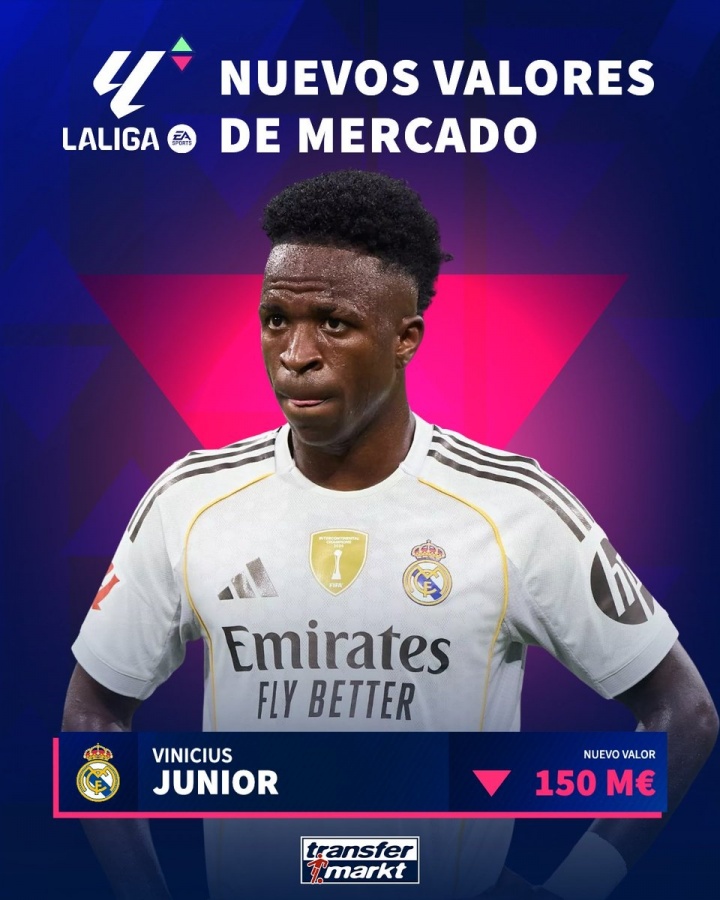 10月02日讯 德转今天发布了最新一期西甲身价更新,维尼修斯成为这次更新的焦点,他的身价从1.7亿欧下跌到了1.5亿欧。