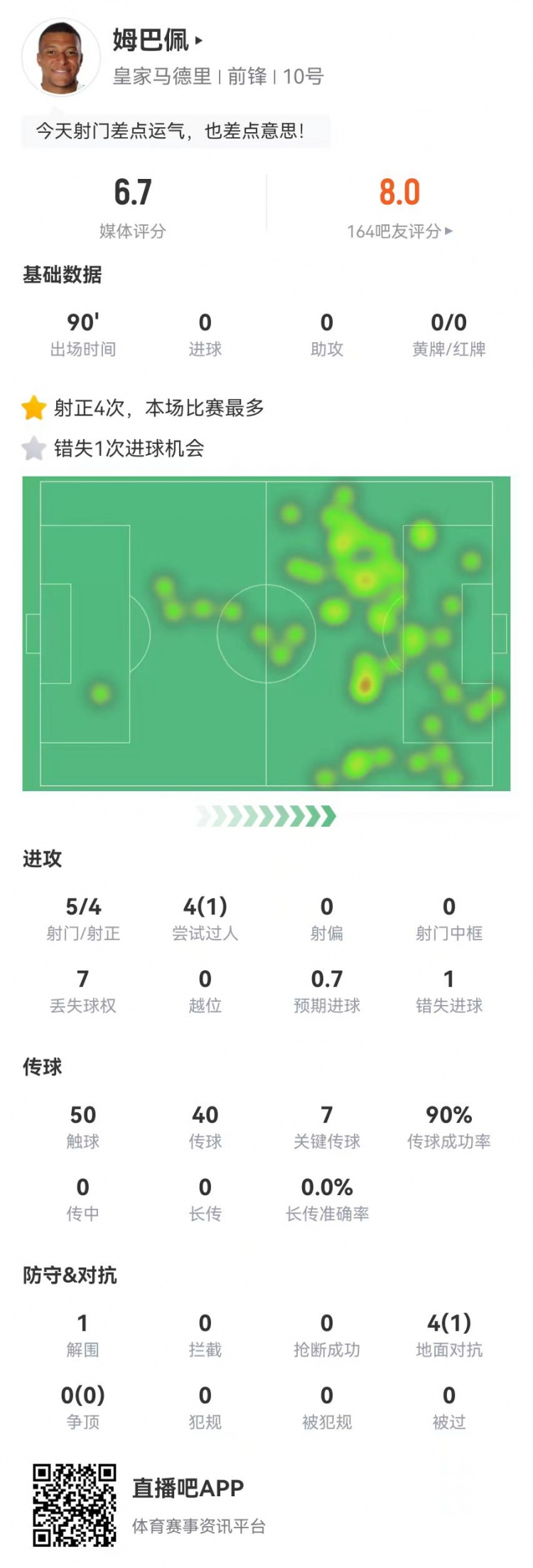 10月23日讯 皇马在本轮欧冠焦点战主场作战 1-0小胜尤文,欧洲杯直播姆巴佩本场数据如下: