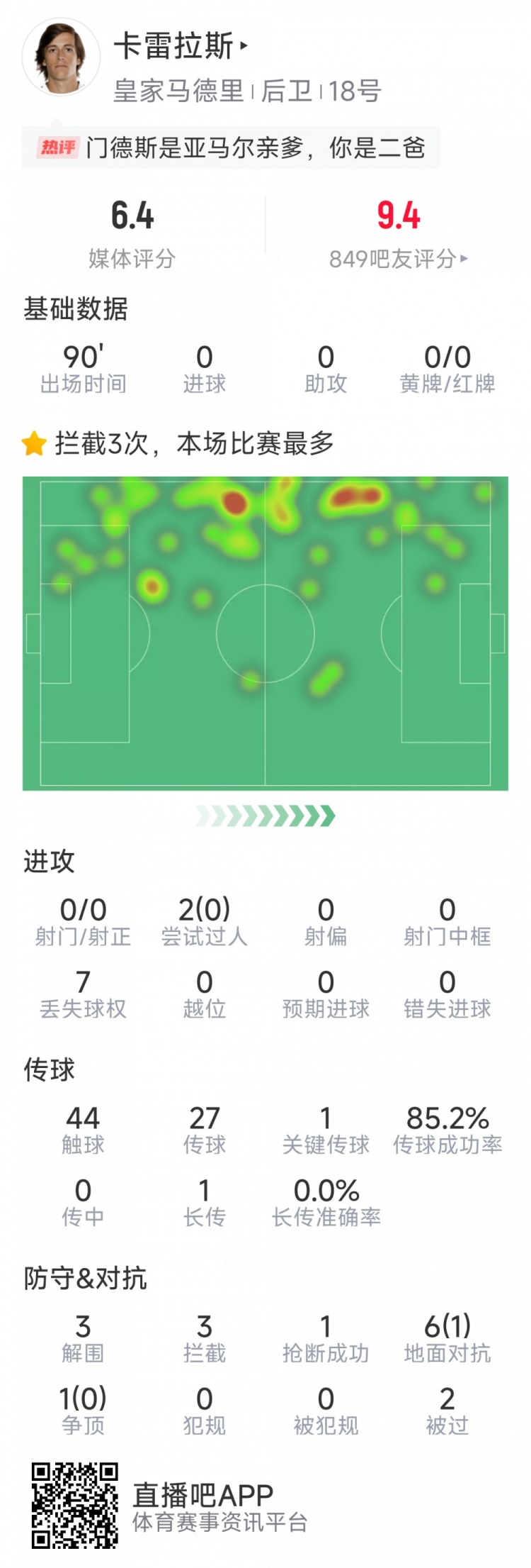 卡雷拉斯本场贡献3次阻拦 ,1次抄截 ,还有3次解围。