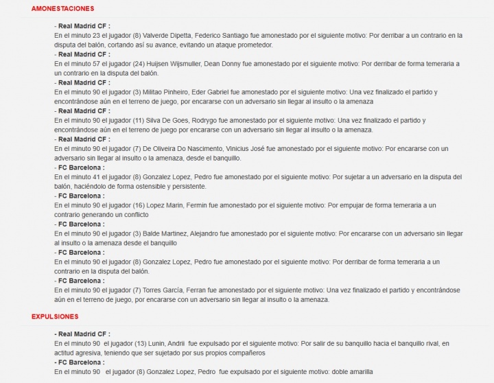 此外,费兰、巴尔德、费尔明、罗德里戈与米利唐因赛事 结束仍在场上与对手对峙吃到警告 。