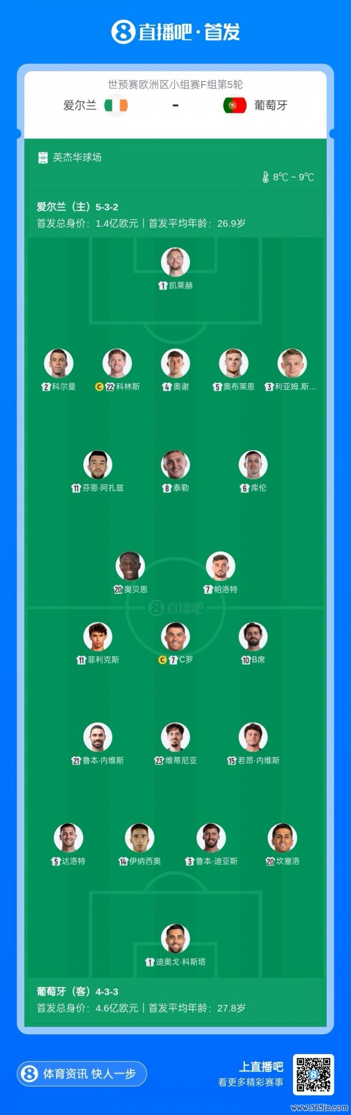 11月14日讯 世预赛欧洲区小组赛F组第5轮,爱尔兰主场作战 迎战葡萄牙,足球直播无插件免费在线观看赛前杆位名单公布。本场赛事 ,葡萄牙只要取胜就能锁定头名晋级下一轮 世界杯赛 。