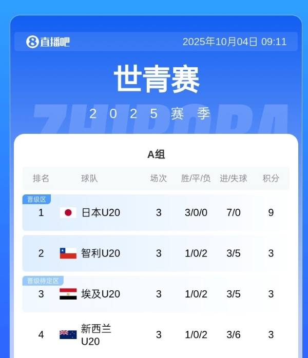 10月04日讯 世青赛小组赛A组第三轮,日本3-0新西兰晋级下一轮 16强。